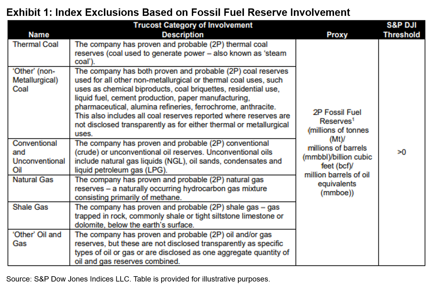 S&P Dow Jones Indices (S&P DJI) has been calculating indices designed to exclude companies with fossil fuel reserves since December 2011, when the S&P Global 1200 Fossil Fuel Reserves Free Index was launched. This index, along with its sub-indices such as the S&P 500® Fossil Fuel Reserves Free Index, measure the performance of companies in their respective underlying benchmark that do not own fossil fuel reserves. As such, these indices may be considered by investors who seek benchmarks to reflect a strategy that divests from fossil fuel reserves.