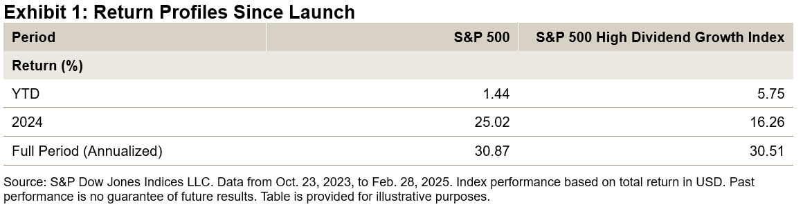 The S&P 500 High Dividend Growth Index has outperformed other leading dividend strategies both YTD and since its launch, posting returns of 5.75% and 30.51% over those periods, respectively. Exhibit 1 shows that in 2024, the index posted strong performance with a 16.26% return, outperforming most dividend strategies.