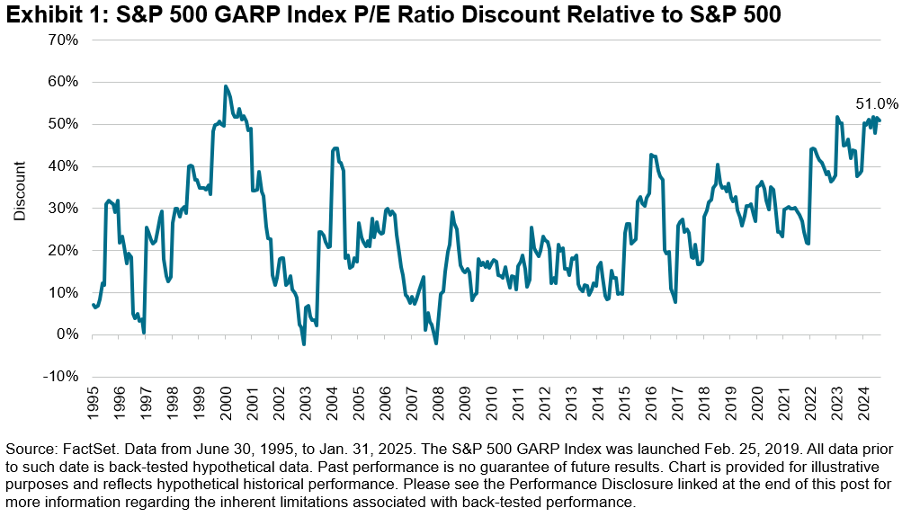Exhibit 1 illustrates the historical trailing 12-month price-to-earnings (P/E) ratio discount of the S&P 500 GARP Index relative to The 500 since June 1995. As of Jan. 31, 2025, the current discount is 51.0%, attributed to The 500’s P/E ratio of 28.3 compared to the S&P 500 GARP Index’s P/E ratio of 13.9.