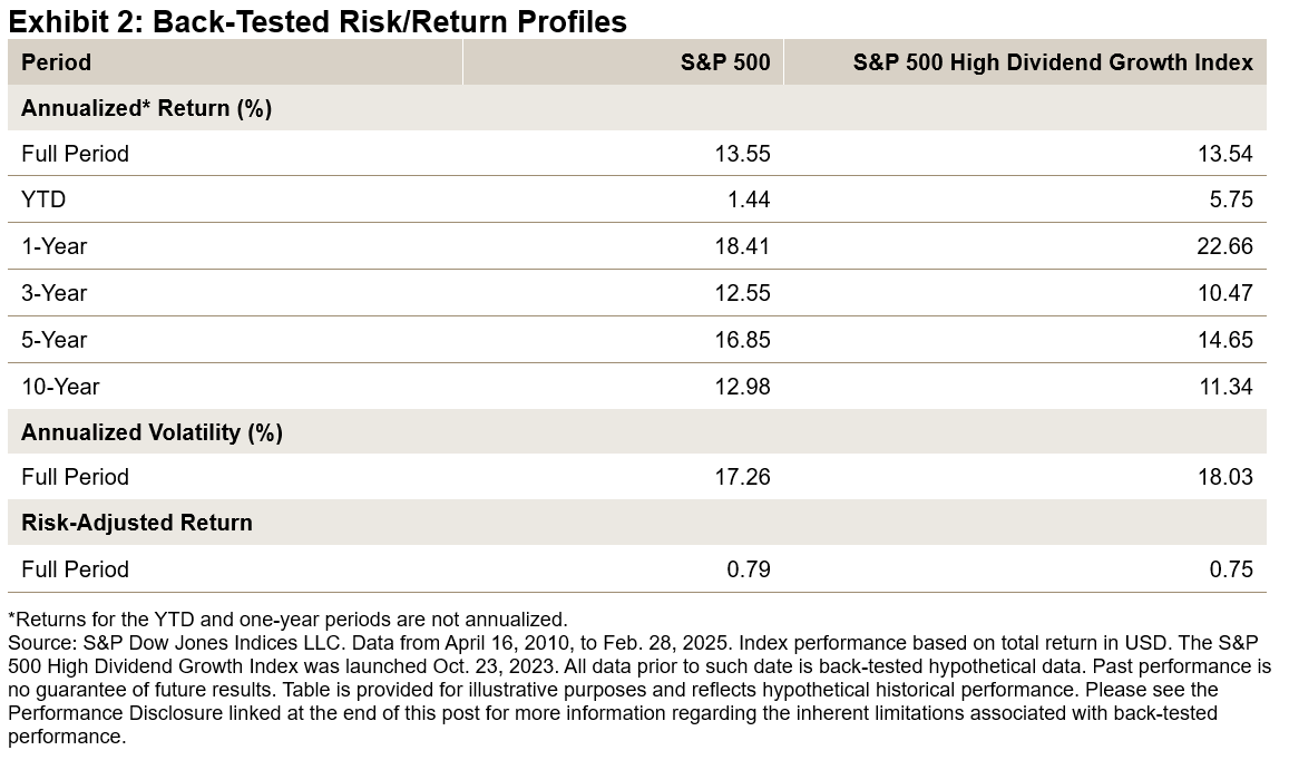 Since 2010, which includes back-tested performance, the S&P 500 High Dividend Growth Index has posted a robust annualized return of 13.54% and a risk-adjusted return of 0.75. The S&P 500 High Dividend Growth Index’s performance has closely aligned with The 500, a notable achievement given the dominance of growth-oriented stocks over the past decade (see Exhibit 2).