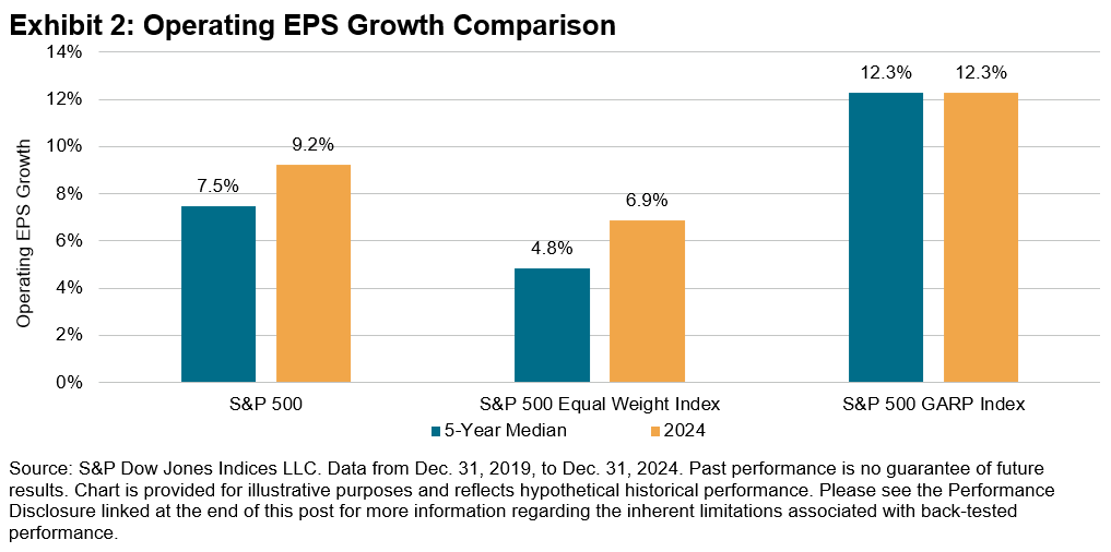 Exhibit 2 shows that the S&P 500 GARP Index’s 2024 operating earnings per share (EPS) growth rate is in line with its five-year median of 12.3%. Both figures indicate a significant premium compared to the operating EPS growth rates of The 500 and the S&P 500 Equal Weight Index in 2024. The five-year median is presented instead of the average due to the volatility of operating EPS, particularly during the 2020-2022 COVID-19 period, which can distort the average calculation.