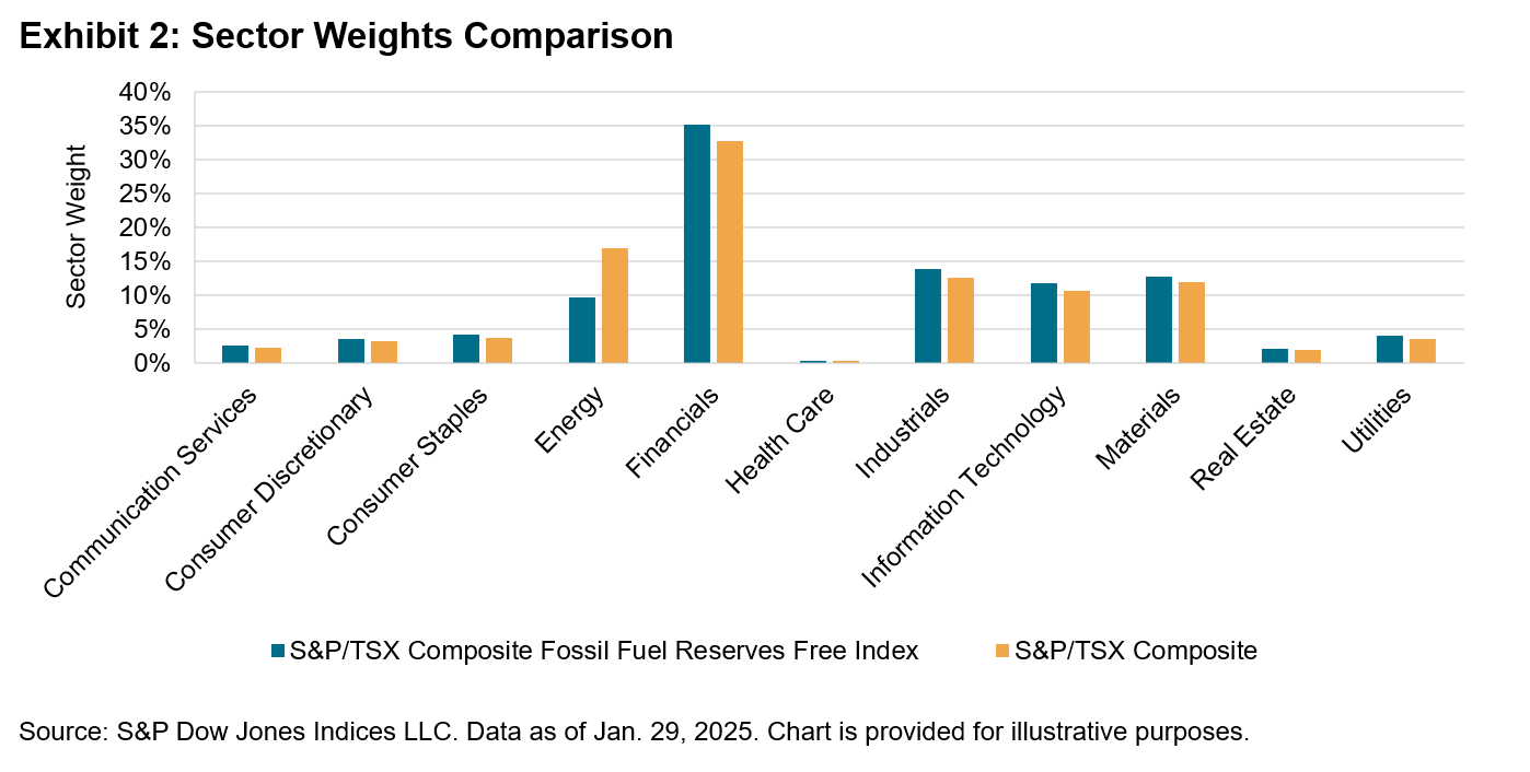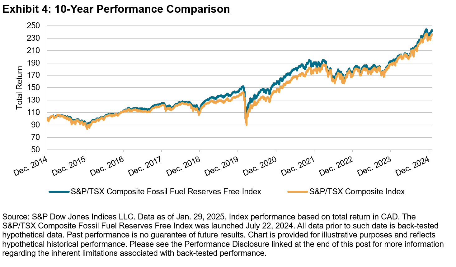 In summary, the S&P/TSX Composite Fossil Fuel Reserves Free Index has historically matched the performance of its benchmark closely, while excluding companies with exposure to fossil fuel reserves. With a number of index-based approaches to climate change-related considerations currently available, this index and its broader series represent one strategy where market participants can gauge the performance of companies, while excluding those with exposure to fossil fuel reserves.