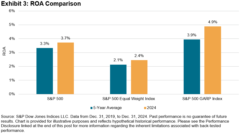 The same trend observed in the operating EPS growth comparison is evident in the quality comparison as well. As shown in Exhibit 3, the S&P 500 GARP Index’s 2024 return on assets (ROA) of 4.9% is 24% higher than its five-year average of 3.9%. In comparison to The 500 and the S&P 500 Equal Weight Index, this 4.9% ROA reflects a 31% and 100% increase, respectively.