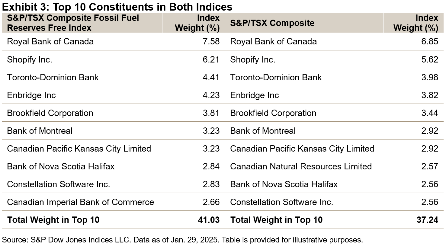 In terms of constituent make up, the exclusions lead to a slightly greater concentration of the top 10 constituents of the S&P/TSX Composite Fossil Fuel Reserves Free Index versus the benchmark. As Exhibit 3 shows, the top 10 stocks collectively have a greater weighting within the fossil fuel reserves free index, owing to fewer stocks to select from given the applied exclusions.