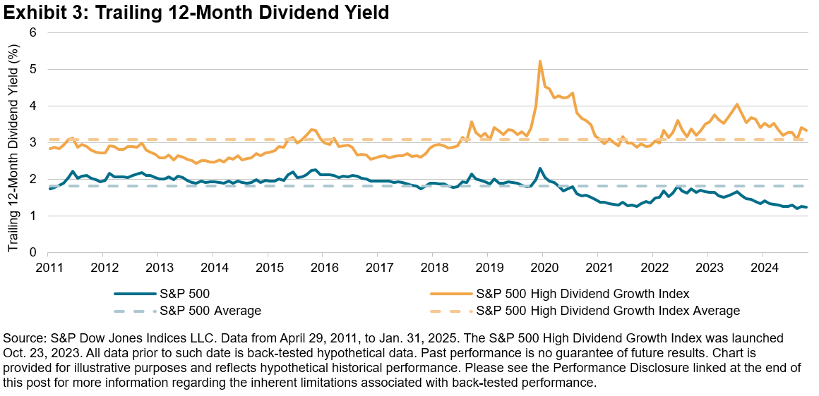 As shown in Exhibit 3, the dividend yield of the S&P 500 High Dividend Growth Index consistently outpaced the dividend yield of The 500 from 2011 to 2025. On average, the S&P 500 High Dividend Growth Index’s dividend yield was 3.09%, outperforming The 500’s dividend yield (of 1.82%) by 1.27%.