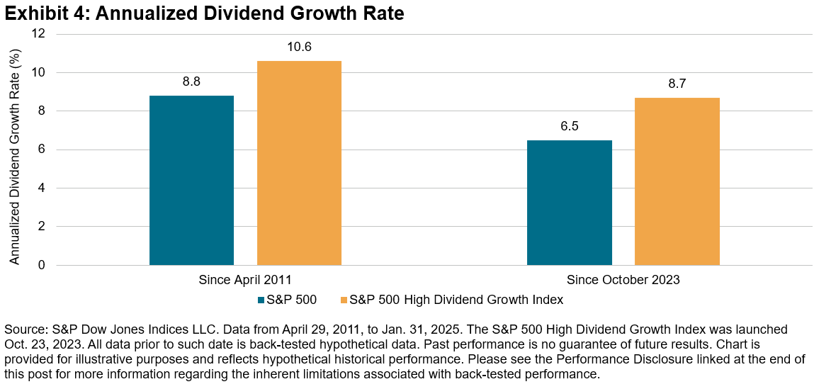 From 2011 to 2025, the S&P 500 High Dividend Growth Index and The 500 grew their dividends at annual rates of 10.6% and 8.8%, respectively. More recently, from 2023 to 2025, the S&P 500 High Dividend Growth Index’s dividend growth rate was 8.7%, surpassing The 500’s 6.5% rate (see Exhibit 4).