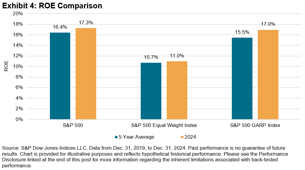 The S&P 500 GARP Index’s 2024 return on equity (ROE) of 17.0% is 10% above its five-year average and is closely aligned with The 500’s 2024 ROE of 17.3% (see Exhibit 4). Compared to the S&P 500 Equal Weight Index’s ROE of 11.0%, the S&P 500 GARP Index’s ROE reflects a 54% premium.