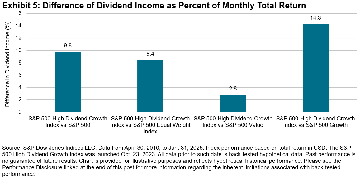 As displayed in Exhibit 5, dividends contributed a greater percentage to the total return of the S&P 500 High Dividend Growth Index than to the total returns of the market-cap and equal-weight benchmarks, as well as style indices like value and growth. Notably, the dividend contributions of the S&P 500 High Dividend Growth Index were 9.8 percentage points higher than those of The 500.