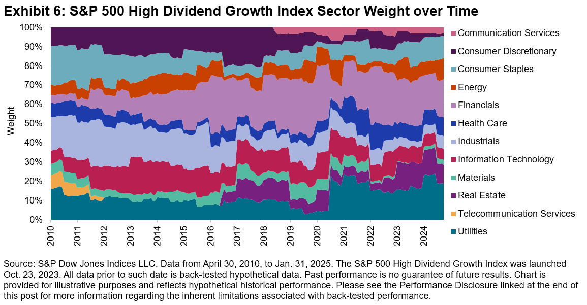 Exhibit 6 shows how the sector weights of the S&P 500 High Dividend Growth Index have changed over time. On average, the largest sector weights in the index have been Financials, Industrials, Utilities and Information Technology. For a dividend strategy, the weights across the sectors have been overall balanced.