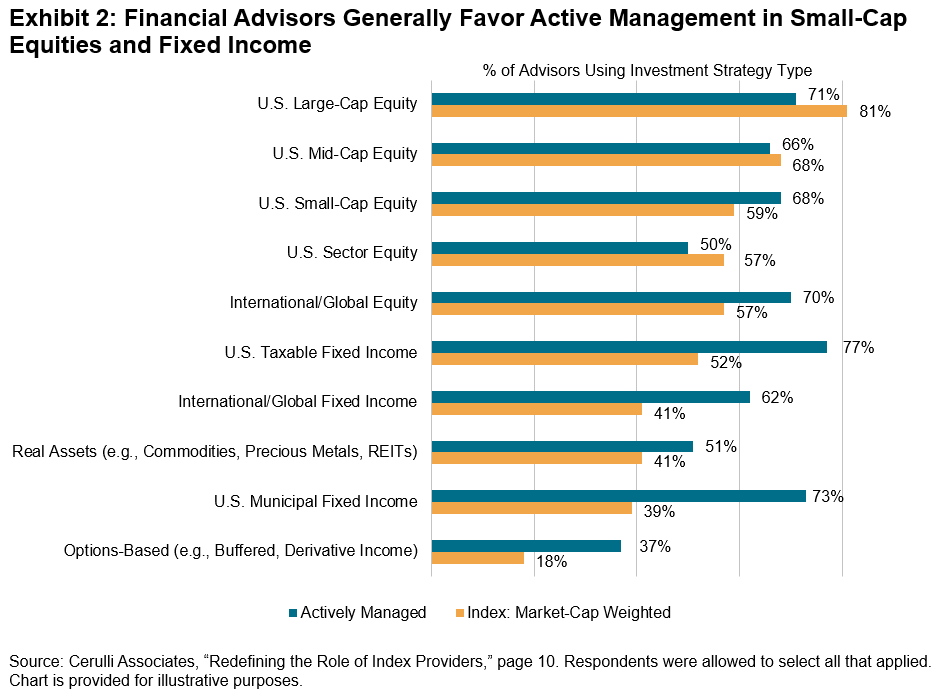 Although Cerulli Associates forecasts increased usage of index-based strategies, Exhibit 2 indicates that advisors currently pursue an active approach in sub-asset classes they perceive as being less informationally efficient, such as small-cap equities, international fixed income, U.S. taxable and municipal fixed income, options-based assets and real assets. However, a future shift could be in the cards. Cerulli Associates’ research suggests that financial advisors could expand their usage of index-based products beyond equities to fixed income as well,3 paralleling the growth of indexing in fixed income.4