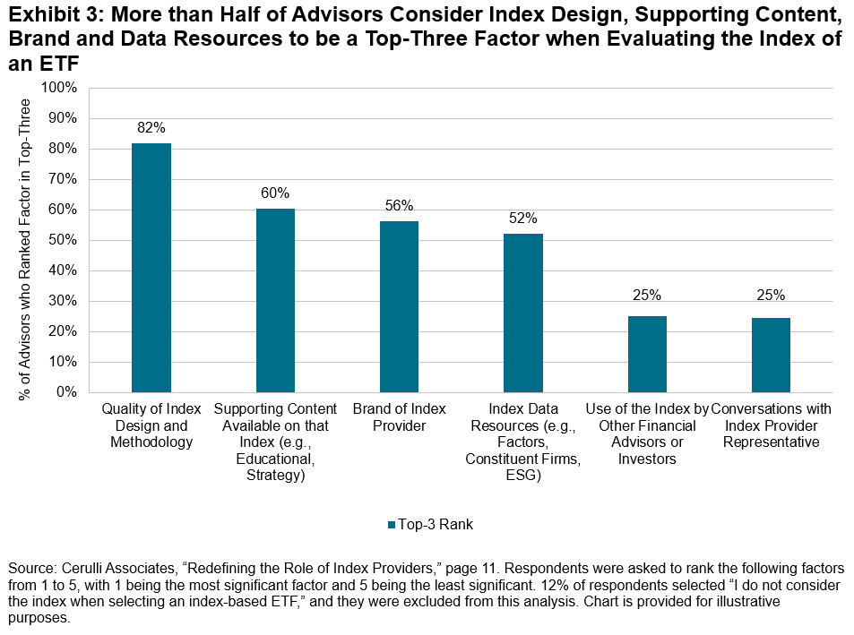 In addition to surveying advisors on how they utilize index-based products, they also extracted insights on how they evaluate them. For example, Exhibit 3 shows that 82% of advisors indicated that the quality of the index design and methodology was a top-three factor when considering the index that underlies an ETF, and 60% of advisors said the same of index provider content and education. To learn more about how financial advisors think about index providers, Cerulli Associates created a series of advisor profiles located in the appendix of the whitepaper.
