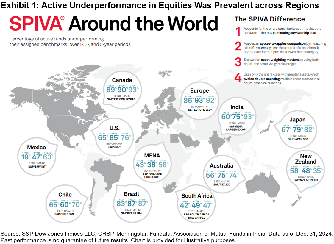 2024 was another challenging year for active managers, with a cross-category, fund-weighted average of 71% of equity funds listed across all regions in Exhibit 1 underperforming their respective benchmarks. Exhibit 1 shows the underperformance rates by region for selected equity fund categories across 1-, 3- and 5-year horizons. Note that majority outperformance in 2024 was only achieved by active managers in Mexico, South Africa and the MENA region.