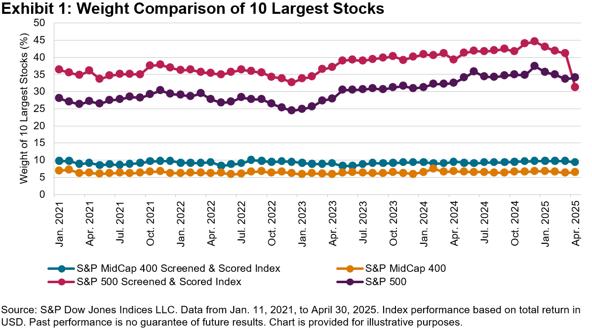 Starting with concentration, Exhibit 1 illustrates the weight of the 10 largest stocks in the S&P MidCap 400 Scored & Screened Index since its launch on Jan. 11, 2021, to April 30, 2025. The average weight stood at 9.20%, slightly higher than the S&P MidCap 400’s 6.35%. However, this concentration was significantly lower than the S&P 500 Scored & Screened Index, where the 10 largest stocks accounted for an average weight of 37.82% versus 30.05% for the S&P 500®. This indicates that while the S&P MidCap 400 Scored & Screened Index showed some concentration, it still retained greater diversification compared to its large-cap counterpart.