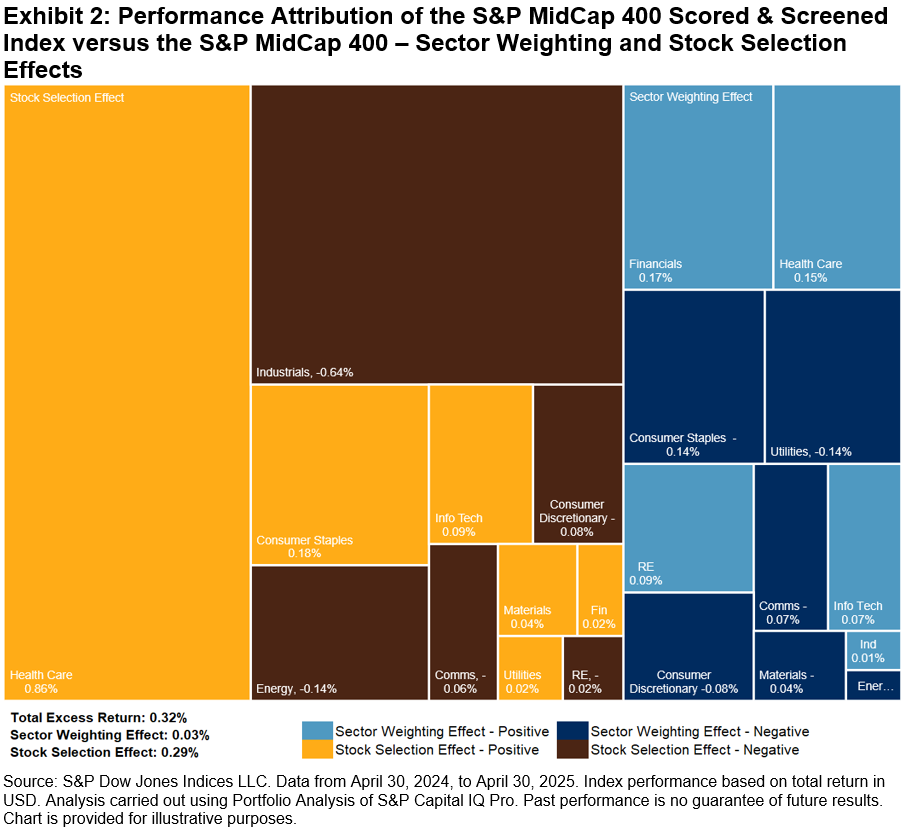 Next, we direct our attention to sectoral weights and their relation to excess return in the S&P MidCap 400 Scored & Screened Index versus the S&P MidCap 400. Exhibit 2 summarizes the results of the Brinson3 attribution analysis for the year ending April 30, 2025. The S&P MidCap 400 Scored & Screened Index outperformed the S&P MidCap 400 by 0.32%, primarily due to stock selection effects (0.29%) as opposed to sector weighting effects (0.03%). This aligns with the index’s construction methodology, which aims to maintain overall similar industry weights to the S&P MidCap 400.