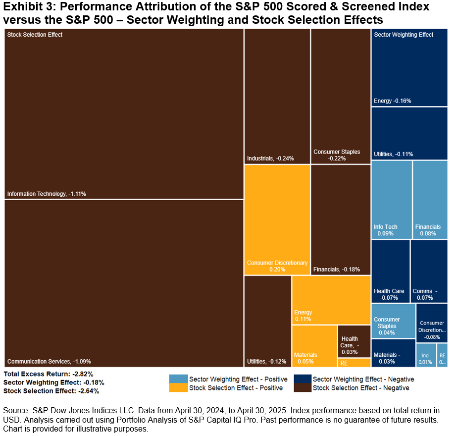 Further analysis of excess returns reveals key distinctions between the S&P MidCap 400 Scored & Screened Index and its large-cap counterpart, the S&P 500 Scored & Screened Index. Exhibit 3 summarizes the results of a similar Brinson2 attribution analysis and shows that the S&P 500 Scored & Screened Index underperformed the S&P 500 by 2.82% over the one-year period shown, primarily due to negative stock selection effects (-2.64%). Sector contributions varied significantly: the performance of the S&P MidCap 400 Scored & Screened Index was boosted by the Health Care (0.86%) sector, while Industrials (-0.64%) contributed negatively to performance (see Exhibit 2). Conversely, the S&P 500 Scored & Screened Index faced significant negative selection effects in Information Technology (-1.11%) and Communication Services (-1.09%), with only a minor negative stock selection effect from Health Care (-0.03%; see Exhibit 3).