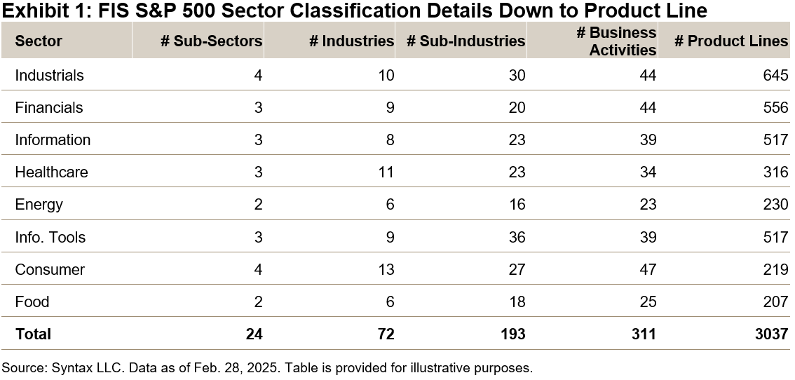 This six-level classification system captures the diverse business models and product lines of companies. As shown in Exhibit 1, the FIS sector taxonomy consists of 8 sectors, 24 sub-sectors, 72 industries, 193 sub-industries, 311 business activities and over 3000 individual product lines in the S&P 500 universe.