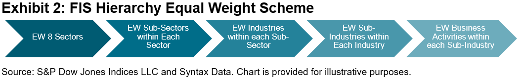 The S&P 500 Diversified Sector Weight Index equally weights each of the eight primary sectors defined by Syntax FIS with quarterly rebalancing.1 Within each sector, level 2 sub-sectors are equally weighted, as are level 3 industries, and so forth down to business activities level (see Exhibit 2). At the lowest level, within each business activity,2 stocks are weighted proportionally based on the revenue generated within that specific activity.