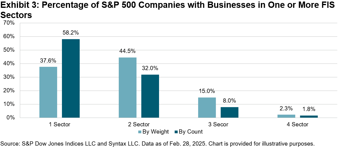 As shown in Exhibit 3, over 41% of S&P 500 companies engage in business activities across more than one FIS sectors, collectively accounting for 62% of the index’s total weight.