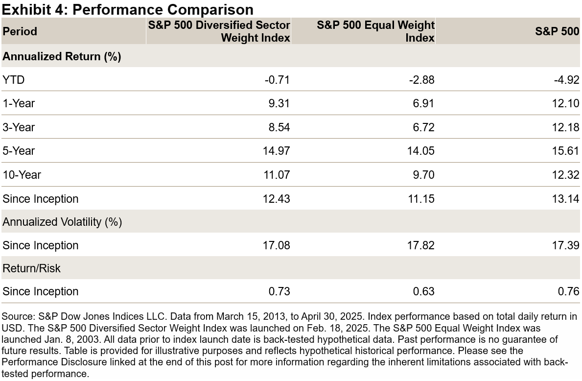 Exhibit 4 illustrates that S&P 500 Diversified Sector Weight Index has historically outperformed the S&P 500 Equal Weight Index in terms of both absolute returns and risk-adjusted returns, across both short- and long-term periods.
