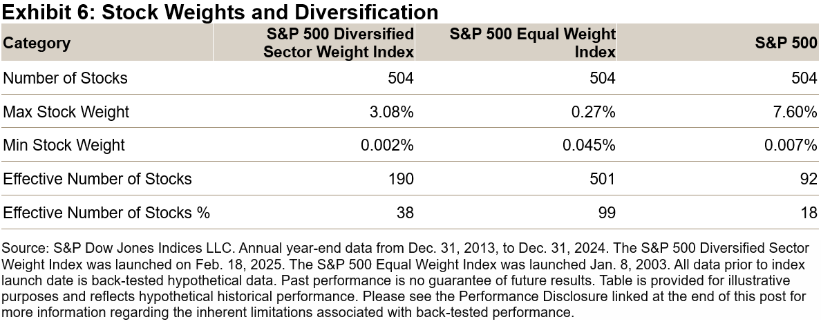 Although primarily designed to equalize sector weights and balance business risks, the S&P 500 Diversified Sector Weight Index has also historically reduced single-stock concentration. Compared to The 500, it maintained a higher effective number of stocks and featured lower maximum stock weights (see Exhibit 6).