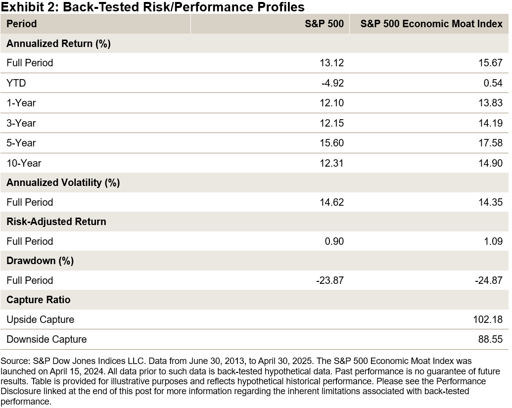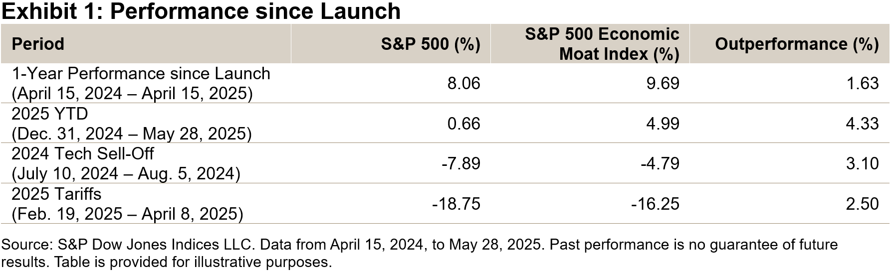 Exhibit 1 shows that the S&P 500 Economic Moat Index outperformed the S&P 500 over the one-year period since its launch (April 15, 2024, to April 15, 2025) and YTD in 2025. Furthermore, it outperformed The 500™ during the two most significant drawdowns in the live period: the tech sell-off in the summer of 2024 and the tariff-related decline in early 2025.