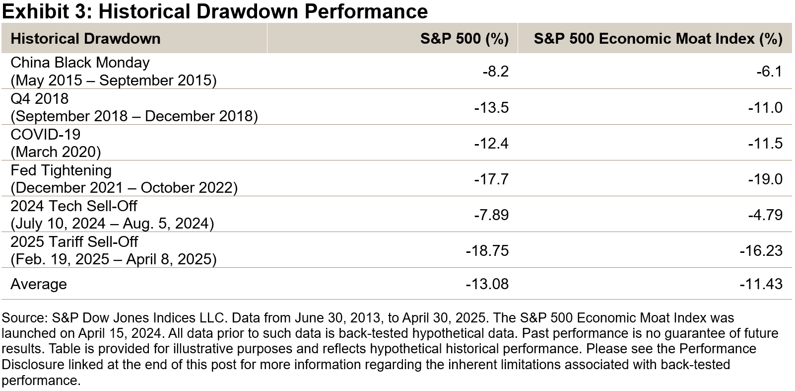 Exhibit 3 shows the historical downside protection offered by the S&P 500 Economic Moat Index during past market selloffs. Over the six major drawdowns shown, the S&P 500 Economic Moat Index recorded an average drawdown of 11.4% versus 13.1% for The 500.