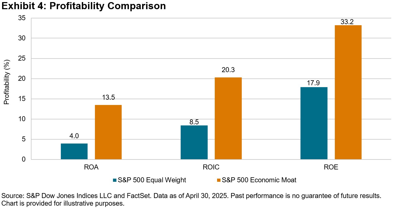 Exhibit 4 showcases the improved profitability metrics such as return on assets (ROA), return on equity (ROE) and return on invested capital (ROIC) of the S&P 500 Economic Moat Index versus the S&P 500 Equal Weight Index. The improved profitability metrics make sense given that one of the key benefits of wide-moat companies is their ability to generate and sustain high returns on capital.
