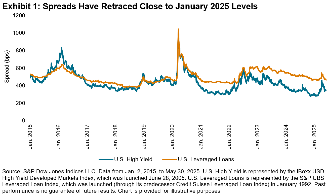 Within fixed income, U.S. high yield and bank loans (see Exhibit 1) felt much of the early-April volatility, with high yield spreads widening to 545 bps before retracing to 473 bps by the end of May. Bank loan spreads moved in similar fashion, reaching a YTD high of 462 bps on April 8 before falling back to 350 bps on May 30.2