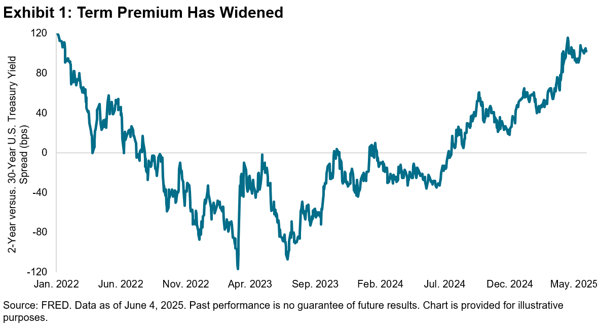 Despite declines across the yield curve on June 4, 2025, following a soft labor market report, 2-Year and 30-Year U.S. Treasury yields have surged by over 23 and 27 bps,1 respectively, since the end of April, with the 30-Year Treasury yield briefly surpassing 5% following weak demand in the 20-Year U.S. Treasury auction. As a result, the spread between short- and long-term U.S. Treasury yields has widened, suggesting that investors may be demanding greater compensation for holding longer-term debt. Exhibit 1 highlights the spread between 2-Year and 30-Year U.S. Treasury yields, which has increased to over 100 bps, reaching levels not seen since 2022.
