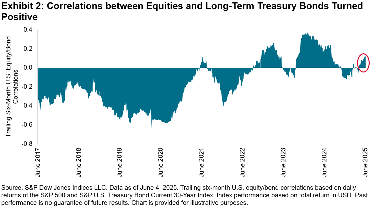 Rising yields also may affect the potential for diversification across asset classes. Traditionally, bonds have tended to exhibit an inverse correlation to equities, with notable outliers such as most of 2024. However, after witnessing negative correlations so far this year, Exhibit 2 reveals that the six-month correlations between The 500™ and the S&P U.S. Treasury Bond Current 30-Year Index have turned positive. If sustained, a positive relationship could be indicative of a potential headwind for risk-adjusted performance for combinations of both asset classes.