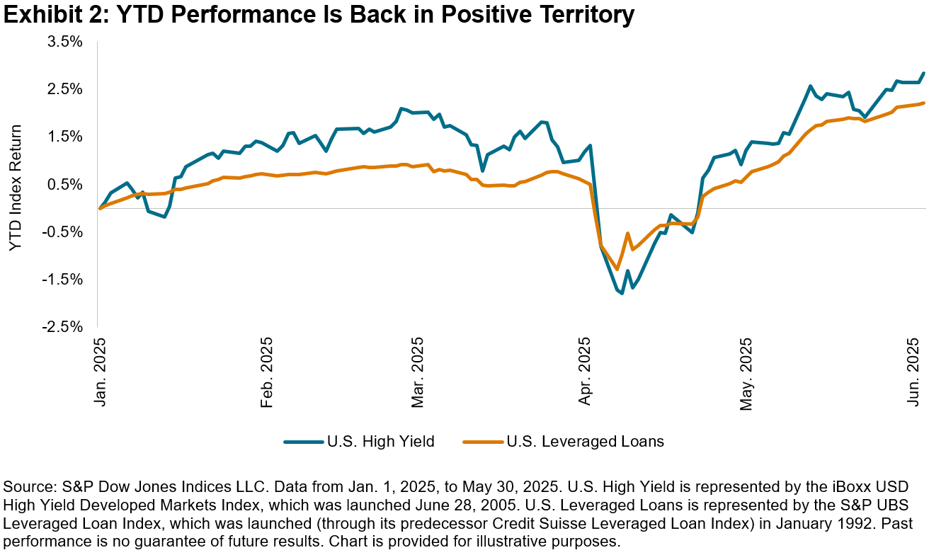 Despite the volatility of the second quarter, leveraged finance asset classes finished May back in positive return territory on a YTD basis, with high yield at 2.6% and bank loans at 2.1% as of May 30, 2025. This rebound was after both markets held negative returns for over two weeks in mid-April.