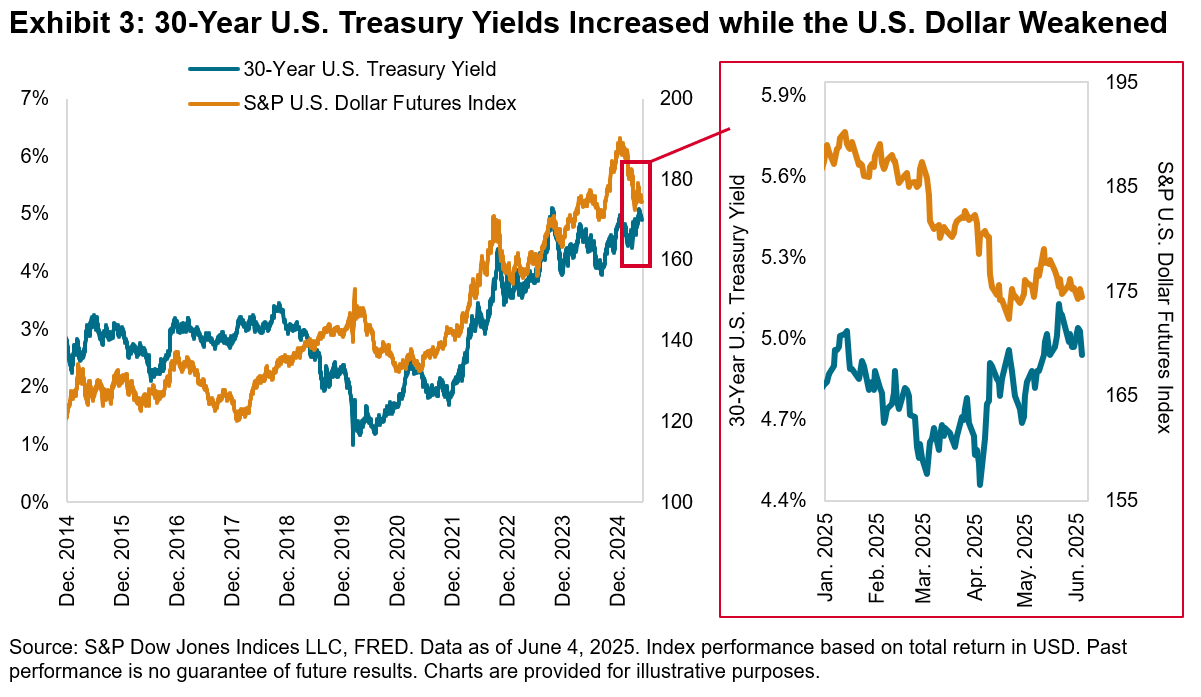 In addition to their impact on diversification, we can also examine the currency dynamics associated with an increase in bond yields, which could be particularly relevant for global asset owners who may be affected by currency hedging decisions. Notably, despite the rise in long-term U.S. Treasury yields, the U.S. dollar has weakened, with the S&P U.S. Dollar Futures Index down 4% quarter-to-date. Although the dollar stabilized in May, the currency’s weakness coinciding with rising bonds yields marks a departure from their typical positive relationship, as shown in Exhibit 3. Recent risks, including fiscal concerns and doubts about the dollar’s safe haven status, may have contributed to this diverging trend.