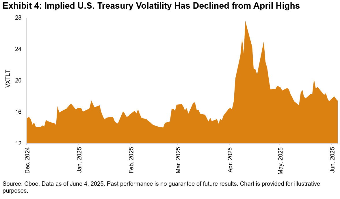 While the future trajectory of U.S. Treasury yields remains uncertain, we can look to market expectations for long-dated U.S. Treasury volatility, as measured by the options market with the Cboe 20+ Year Treasury Bond ETF Volatility Index (VXTLT). After declining from the highs observed during the market turbulence in April, Exhibit 4 shows that VXTLT rose along with longer-dated yields, surpassing the 20 mark on May 21, 2025, and closed above the 17 handle as of June 4.