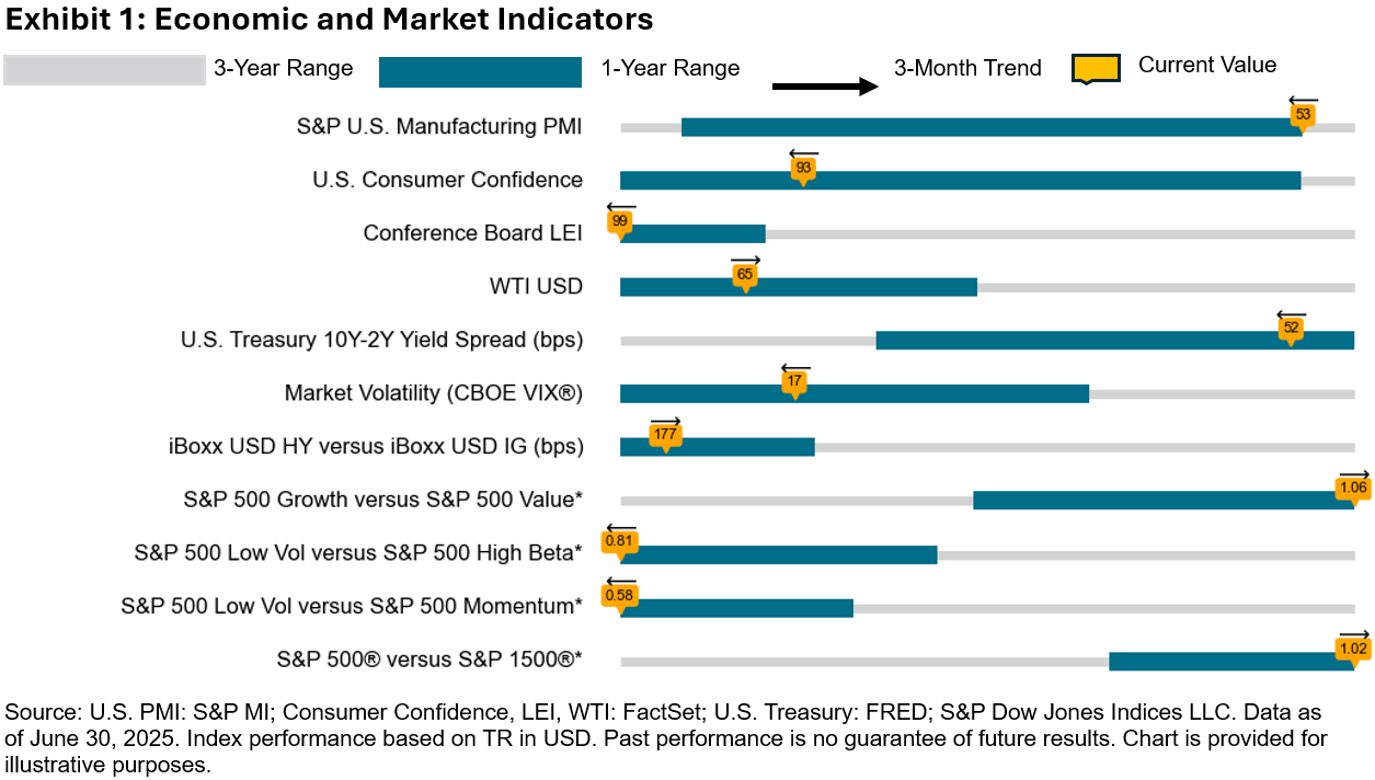 - U. S. Economic & Market Indicators: This section sets the macro and risk sentiment backdrop that is essential for understanding equity performance. Themes vary—from defensive to growth-oriented, domestic to global, and disruptive to mainstream. The macro and market indicators help identify how investor sentiment may impact different themes, positively or negatively.