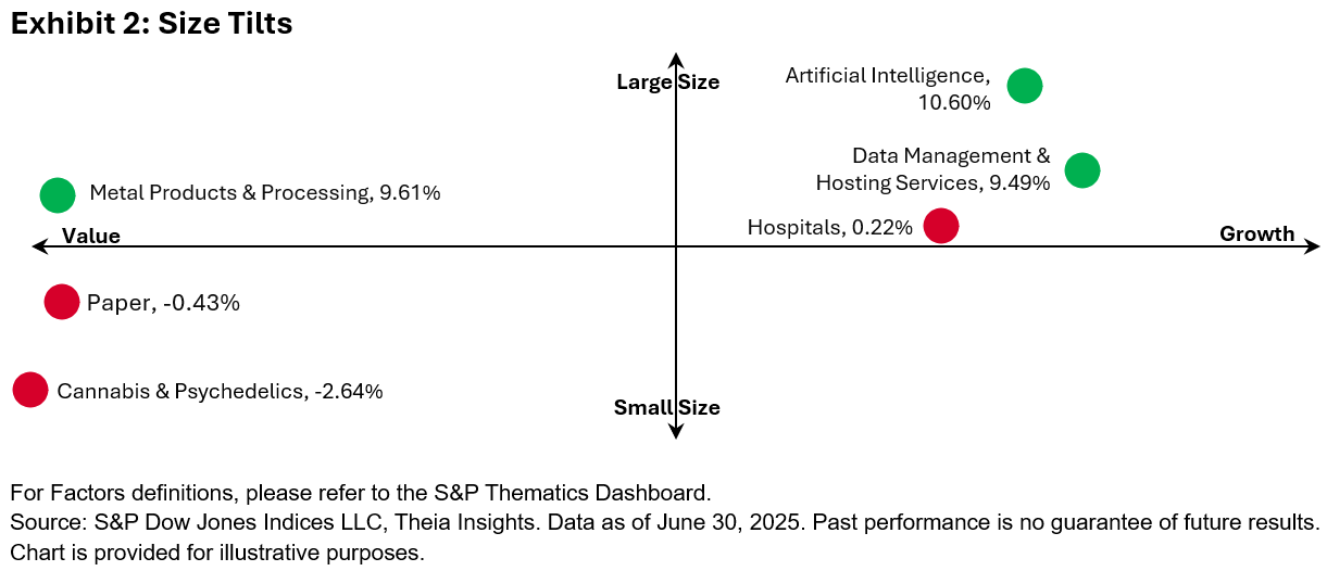 - Factor Tilt Quadrants: To measure underlying style tilts, themes are positioned within a two-dimensional chart based on their size (e.g., small cap versus large cap; see Exhibit 2) and style (e.g., value versus growth) tilts. Each quadrant reflects a different combination of factor characteristics, offering a clear contrast in factor tilts across themes. Recognizing and identifying such tilts helps avoid unintended clustering—such as overweight to small-cap growth—and supports more balanced, diversified thematic views.