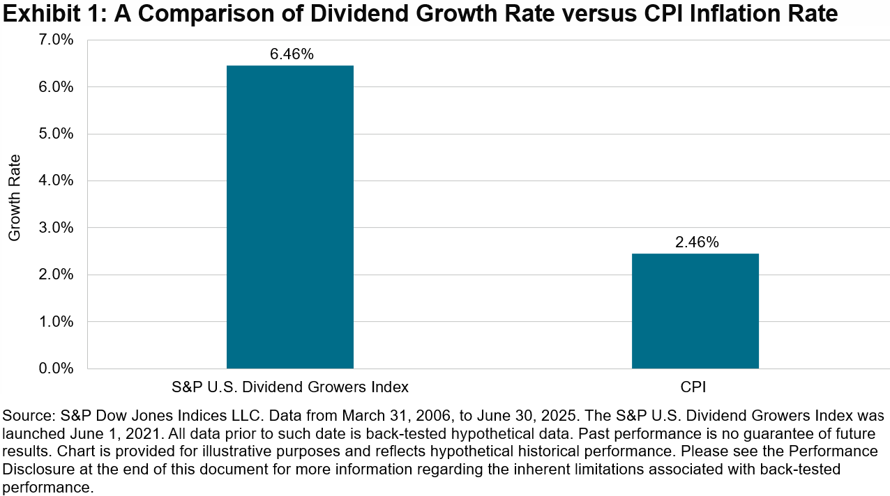 Over the long term, the S&P U.S. Dividend Growers Index has increased its dividends at a rate that exceeds inflation, thereby preserving purchasing power. From 2006 to 2025, the dollar dividends for this index grew at a compound annual growth rate (CAGR) of 6.46%, easily outpacing the Consumer Price Index (CPI)2 inflation rate during the same period.