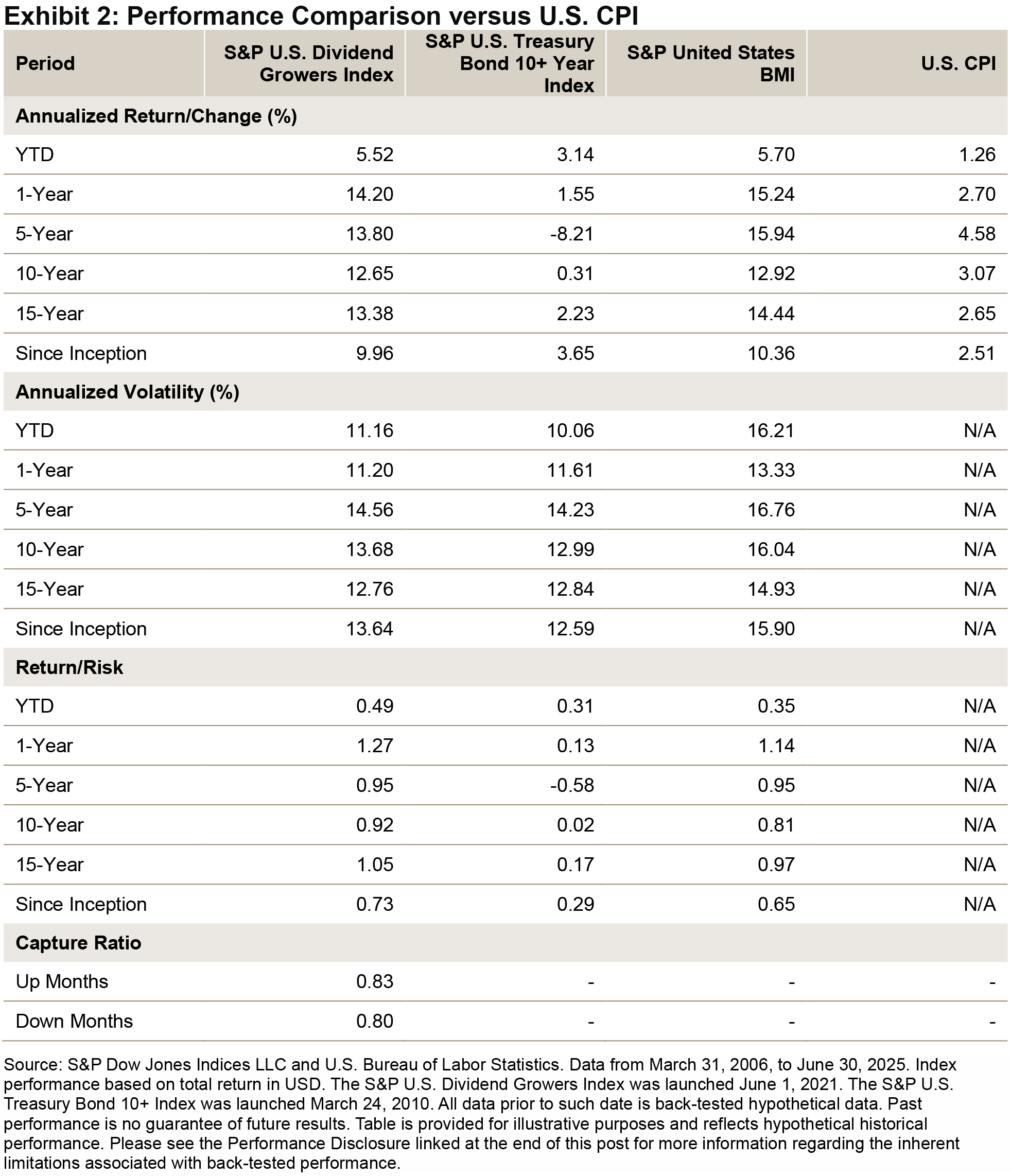 With its consistent dividend growth, the S&P U.S. Dividend Growers Index has exhibited dividend growth that has outpaced inflation while delivering strong performance in terms of both absolute and risk-adjusted returns.