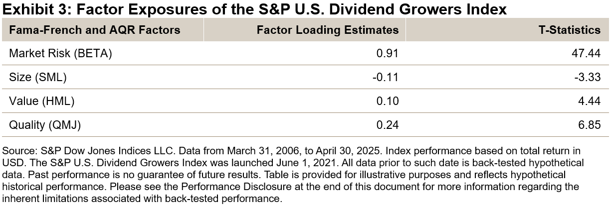 In Exhibit 3, we used the Fama-French Three-Factor Model4 and AQR Quality5 factors to analyze the historical returns of the S&P U.S. Dividend Growers Index. The factor loading estimates and associated t-statistics reveal that the index constituents exhibited positive exposures to lower beta (less than 1), larger size, higher value and higher quality. The empirical results indicate that the index exhibited more defensive characteristics (lower risk), along with superior quality and valuation features compared to the overall market. High quality fundamentals serve as the foundation for consistent dividend increases.