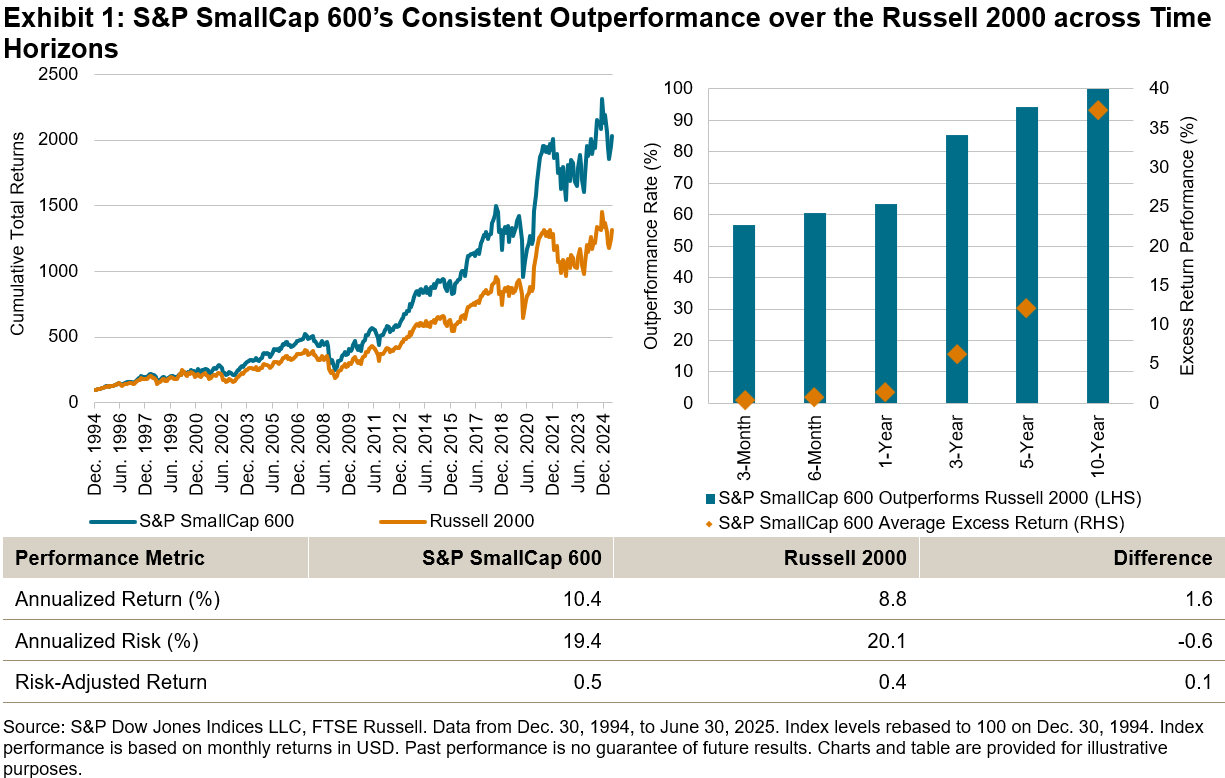The S&P SmallCap 600® represents the U.S. small-cap equity market by tracking companies that meet specific liquidity and financial viability criteria. While both the S&P 600® and Russell 2000 target this segment, their performance has diverged significantly. Since 1994, the S&P 600—built on a rules-based methodology—has consistently outperformed the Russell 2000, delivering a 1.6% higher average return with lower volatility, resulting in a 0.1 improvement in risk-adjusted performance. This gap widened over longer periods (see Exhibit 1).