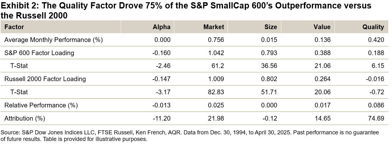 A key driver of this outperformance has been the S&P 600’s statistically significant exposure to the quality factor, which explains about 74.7% of its historical outperformance. Unlike the Russell 2000, the S&P 600 applies an earnings screen that requires consistent profitability for new constituents—a feature historically linked to outperformance in small caps. This analysis explores whether that screen has underpinned the index’s quality tilt (see Exhibit 2).