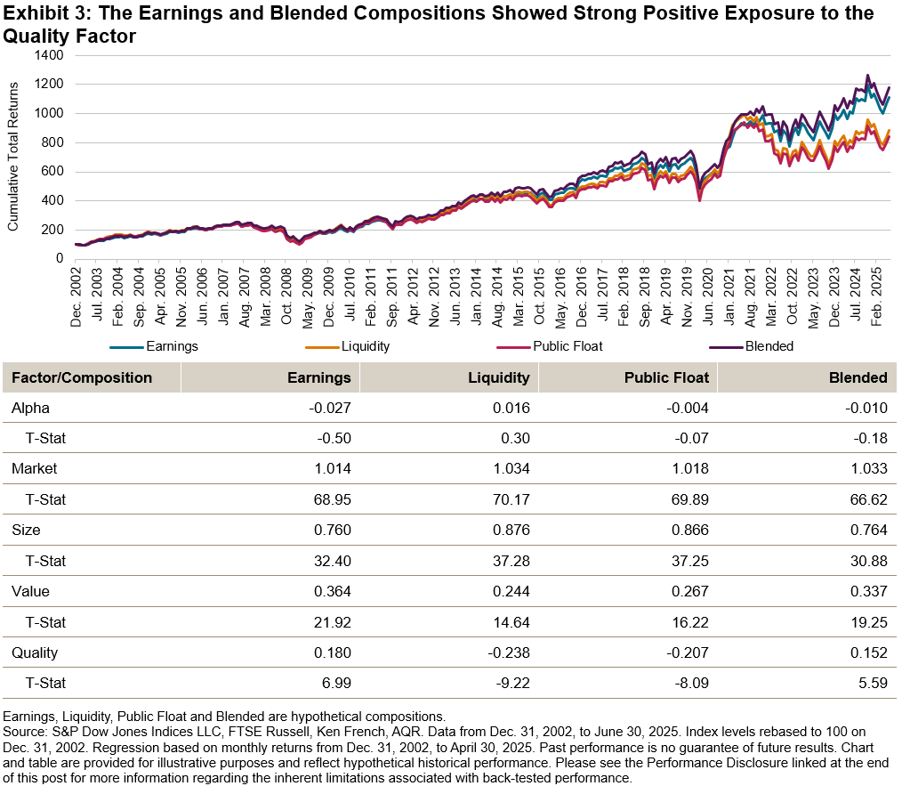 Only the earnings and blended compositions showed strong positive quality factor loadings and superior long-term returns—highlighting profitability as the main contributor to the S&P 600’s quality tilt (see Exhibit 3).