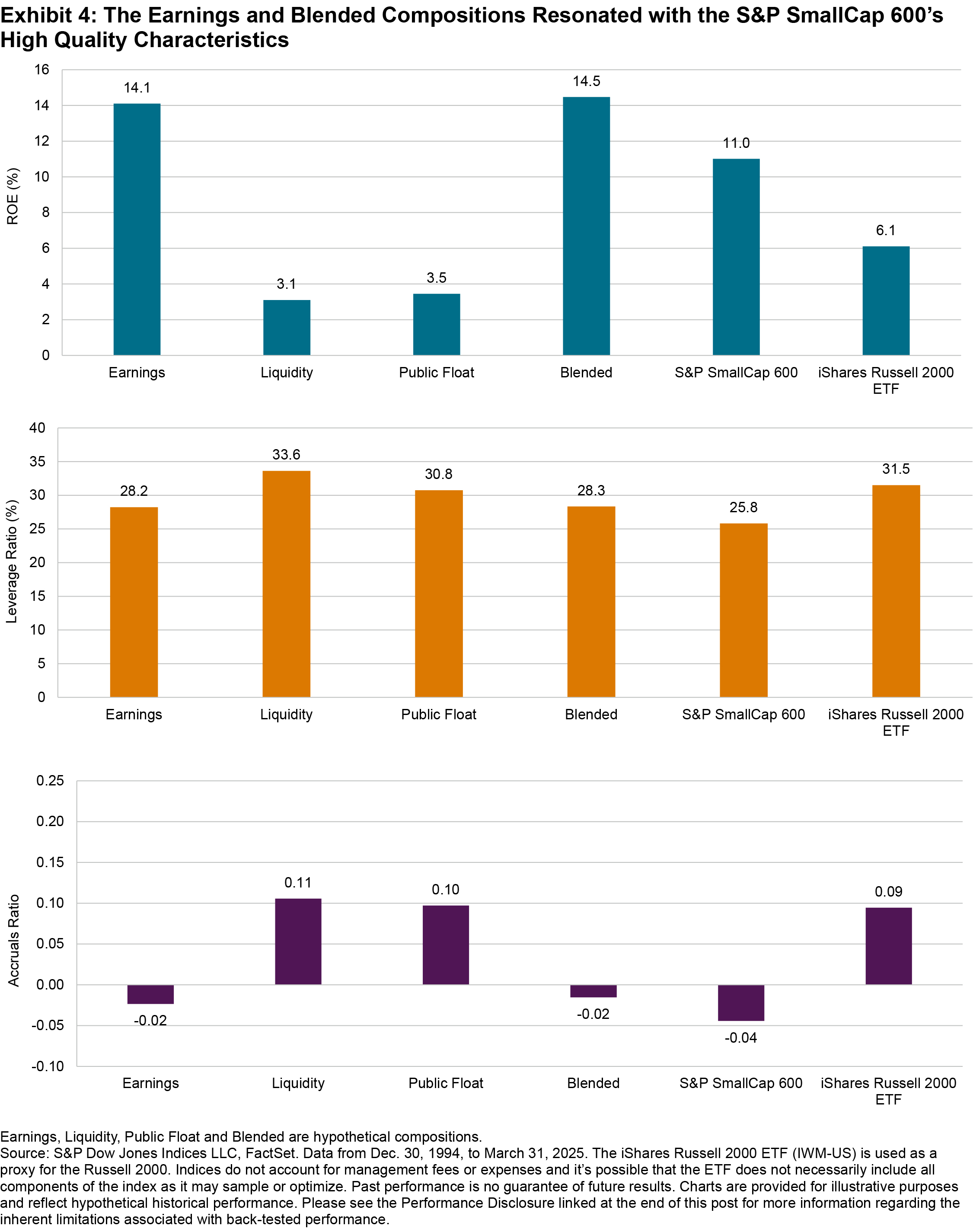 These compositions also aligned with key S&P Quality Index metrics—higher ROE, better earnings quality and lower leverage—closely resembling the S&P 600, while the Russell 2000 lagged (see Exhibit 4).