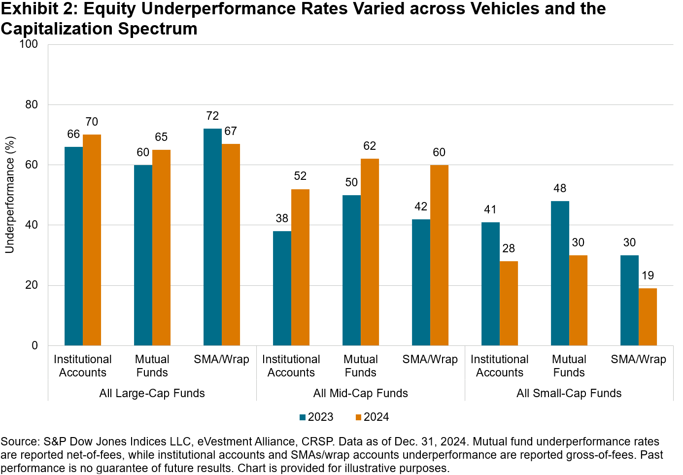 Beating the benchmark can be a challenge regardless of investment vehicle, and SMAs/Wrap accounts are no exception. For a more complete analysis of performance across segregated institutional and SMAs/wrap accounts, we invite you to read our full 2024 SPIVA Institutional Scorecard.