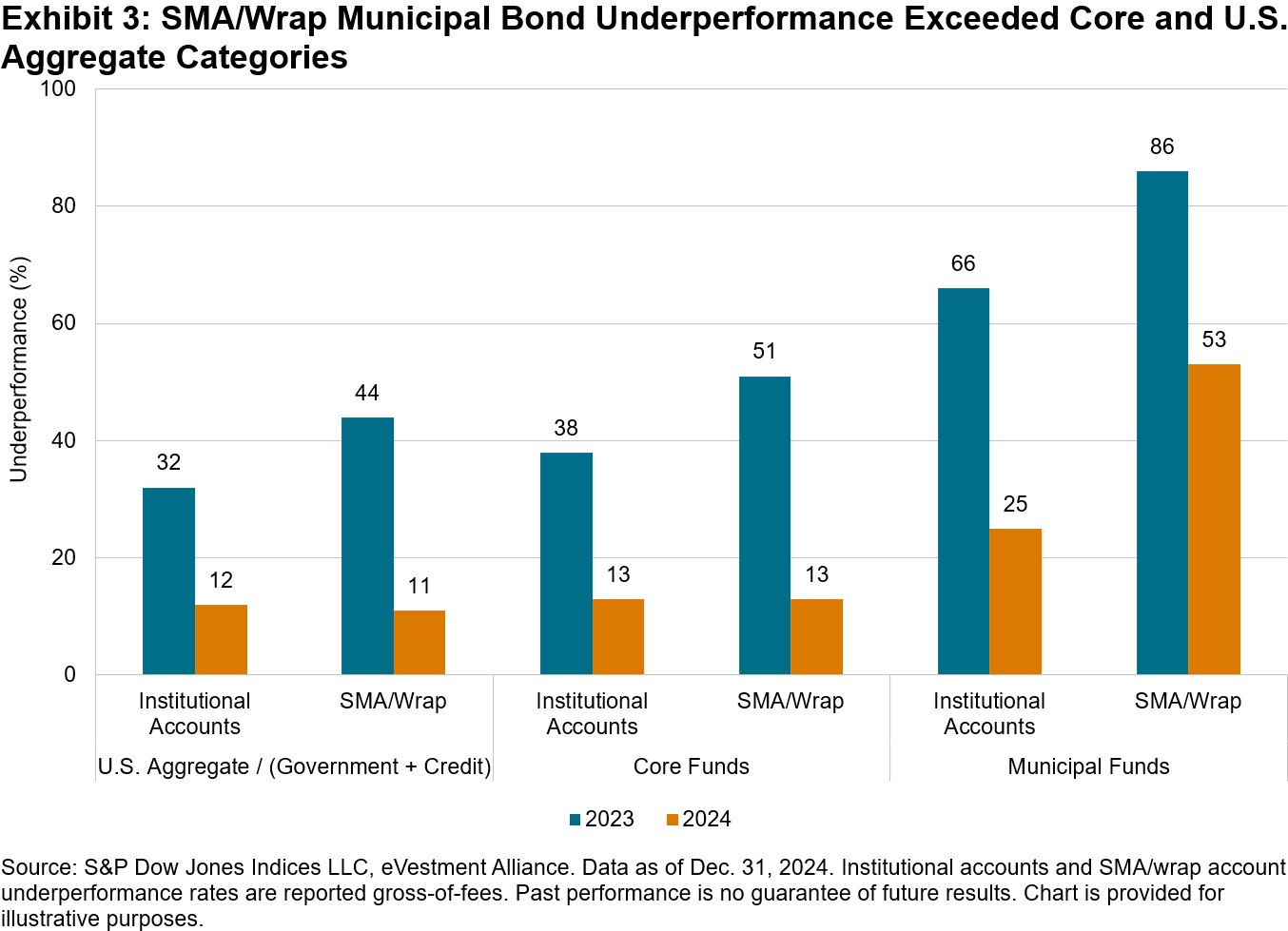 Turning to fixed income SMA/wrap performance, Exhibit 3 shows that U.S. Aggregate and Core accounts delivered majority outperformance, with only 11% and 13% of accounts failing to outperform their benchmarks, respectively, which was an improvement over their institutional peers. However, Municipal accounts may have had a tougher time, with more than half underperforming the S&P National AMT-Free Municipal Bond Index.