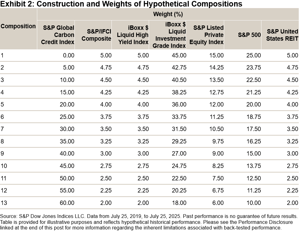 To evaluate the potential diversification characteristics of the S&P Global Carbon Credit Index, we explored 13 hypothetical compositions, as illustrated in Exhibit 2. Starting with Composition 1, which contained only indices #2 to #7 in Exhibit 1, we examined the hypothetical impact of adding weight to the S&P Global Carbon Credit Index in 5% increments, with the remaining composition weights retaining their original relative proportions. As a result, we rebalanced each composition by proportionately decreasing the weight of the other indices, ensuring they retained their initial allocation ratios from Composition 1 in all subsequent compositions, while excluding the weight of the S&P Global Carbon Credit Index. For example, in Composition 1, the S&P 500 represents 25% of the composition. In Composition 2, with the addition of the S&P Global Carbon Credit Index at 5%, the weight of the S&P 500 is adjusted to 23.75%, reflecting 25% of 95% of the total composition.
