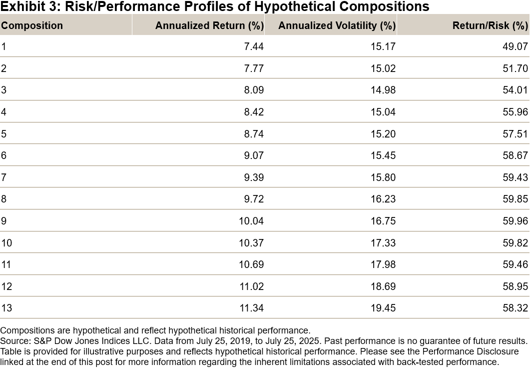Next, we calculated the performance for each hypothetical composition (assuming a daily rebalance to the target weights) for the period from July 25, 2019, to July 25, 2025. The resulting annualized returns, annualized volatilities and corresponding return/risk ratios are summarized in Exhibits 3 and 4.
