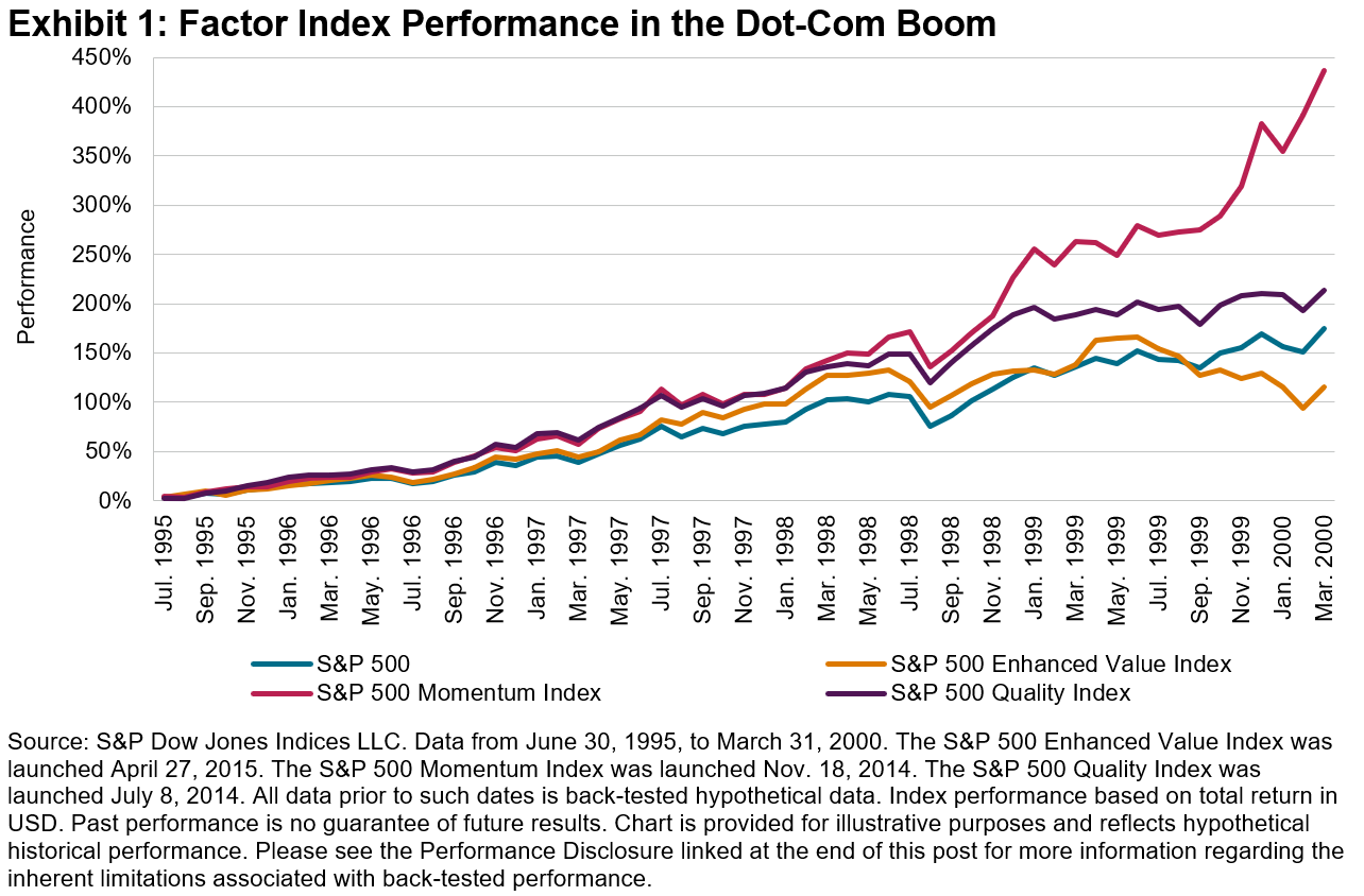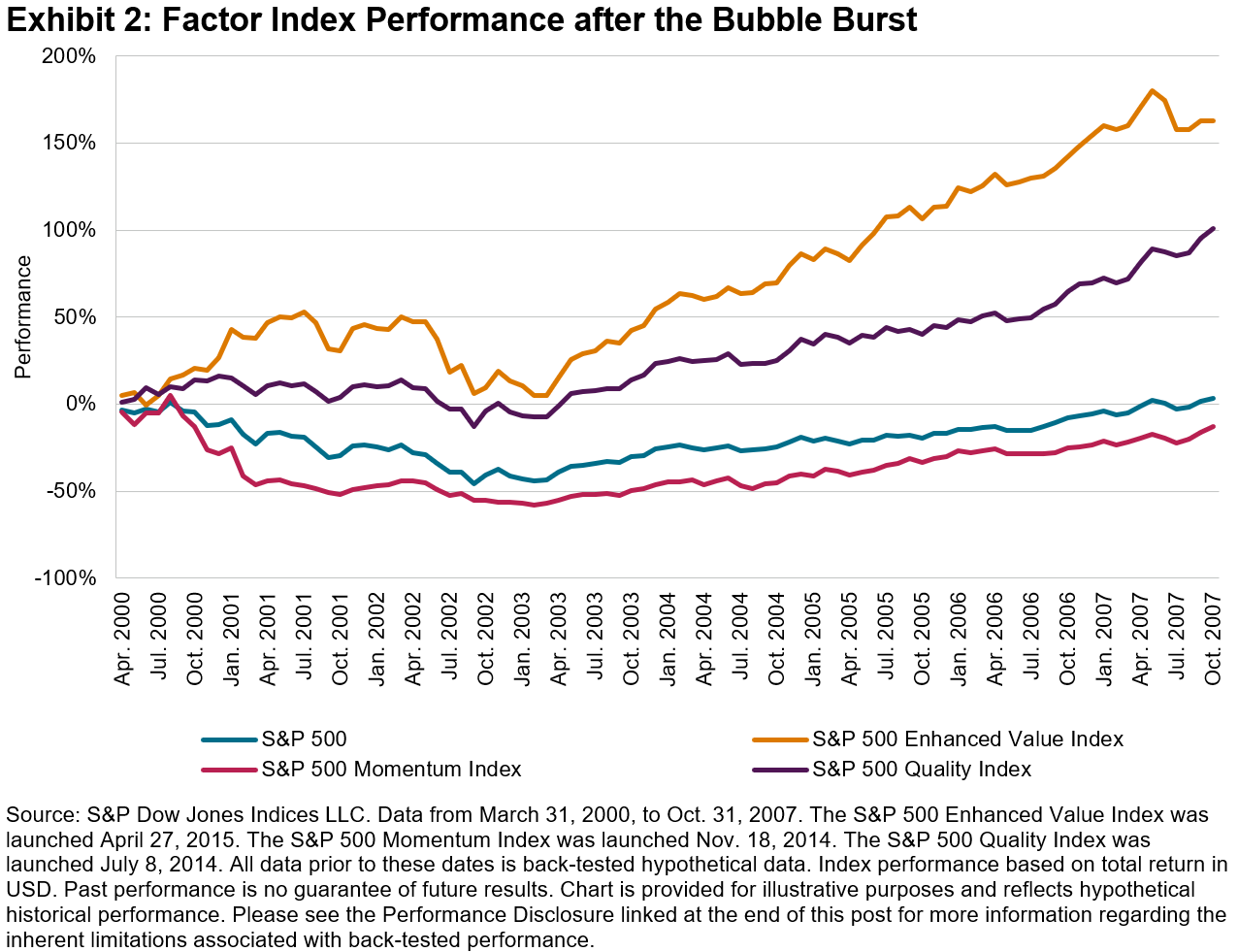 The back-tested data in Exhibit 1 shows that, prior to the bursting of the bubble, the S&P 500 Momentum Index was by far the best performer, while the S&P 500 Quality Index also outperformed The 500 and the S&P 500 Enhanced Value Index materially underperformed as growth-oriented stocks led the market upward.