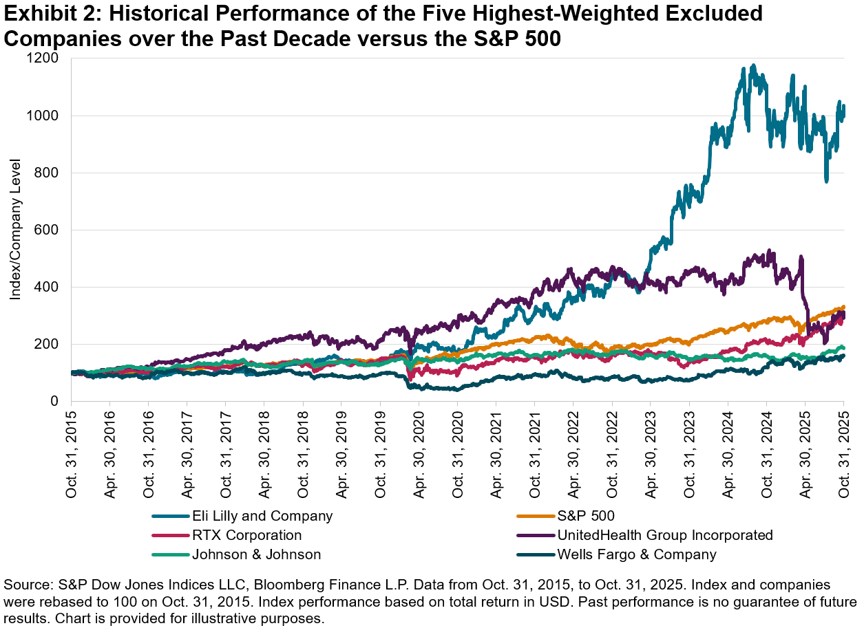 In contrast, Exhibit 2 shows the back-tested performance of the same four indices in the period following the peak. The S&P 500 Enhanced Value Index was the strongest performer by a wide margin, while the S&P 500 Momentum Index struggled. The S&P 500 Quality Index again outperformed The 500, which remained nearly flat during the first part of its “lost decade.”