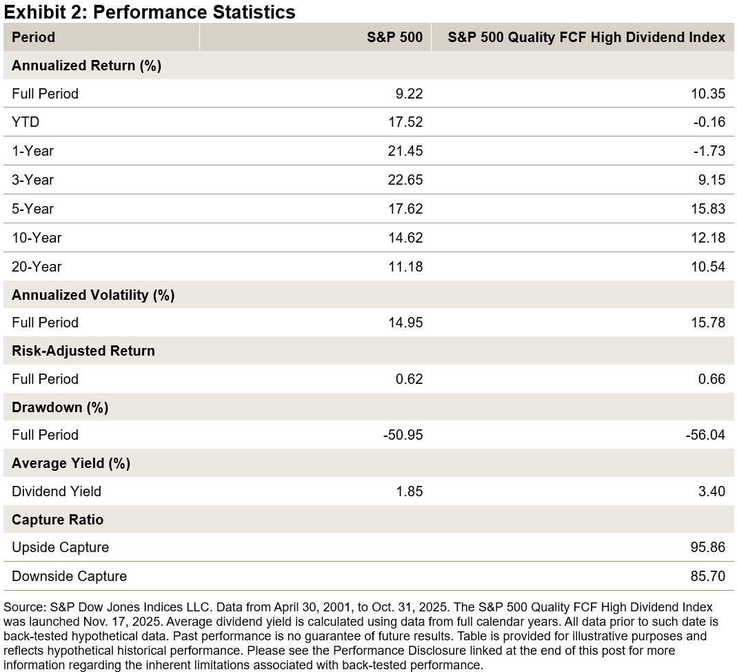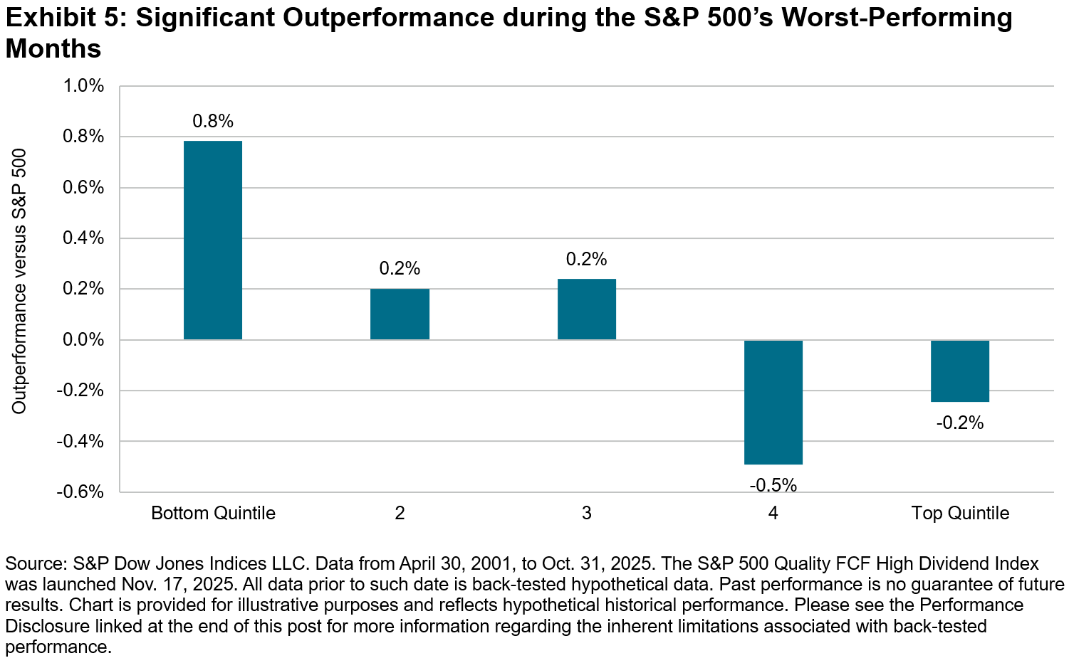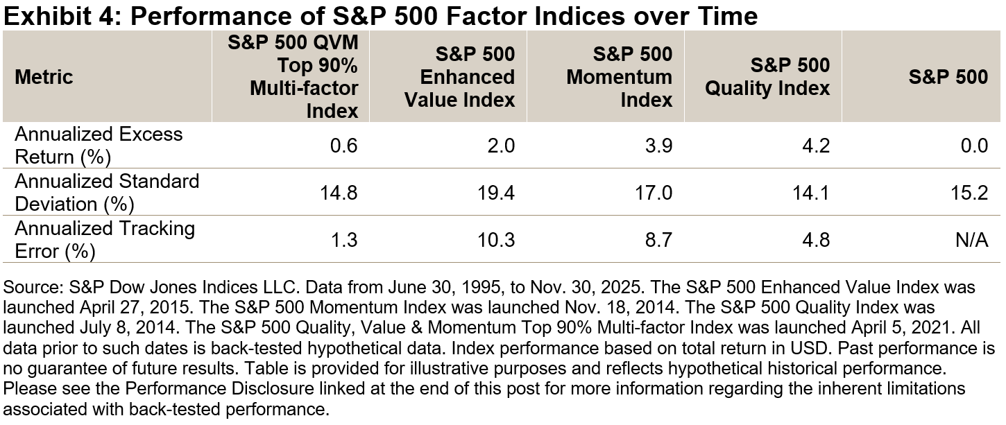 For those less enthused by the prospect of significant deviation from The 500’s performance, the S&P 500 Quality, Value & Momentum (QVM) Top 90% Multi-factor Index may be interesting. The index measures the performance of S&P 500 constituents after excluding the bottom 10% with the lowest combined quality, value and momentum multi-factor score, thus exhibiting some loading on each factor. Exhibit 4 shows that this approach has historically outperformed The 500 while maintaining low tracking error and lower volatility than The 500, S&P 500 Enhanced Value Index and S&P 500 Momentum Index.