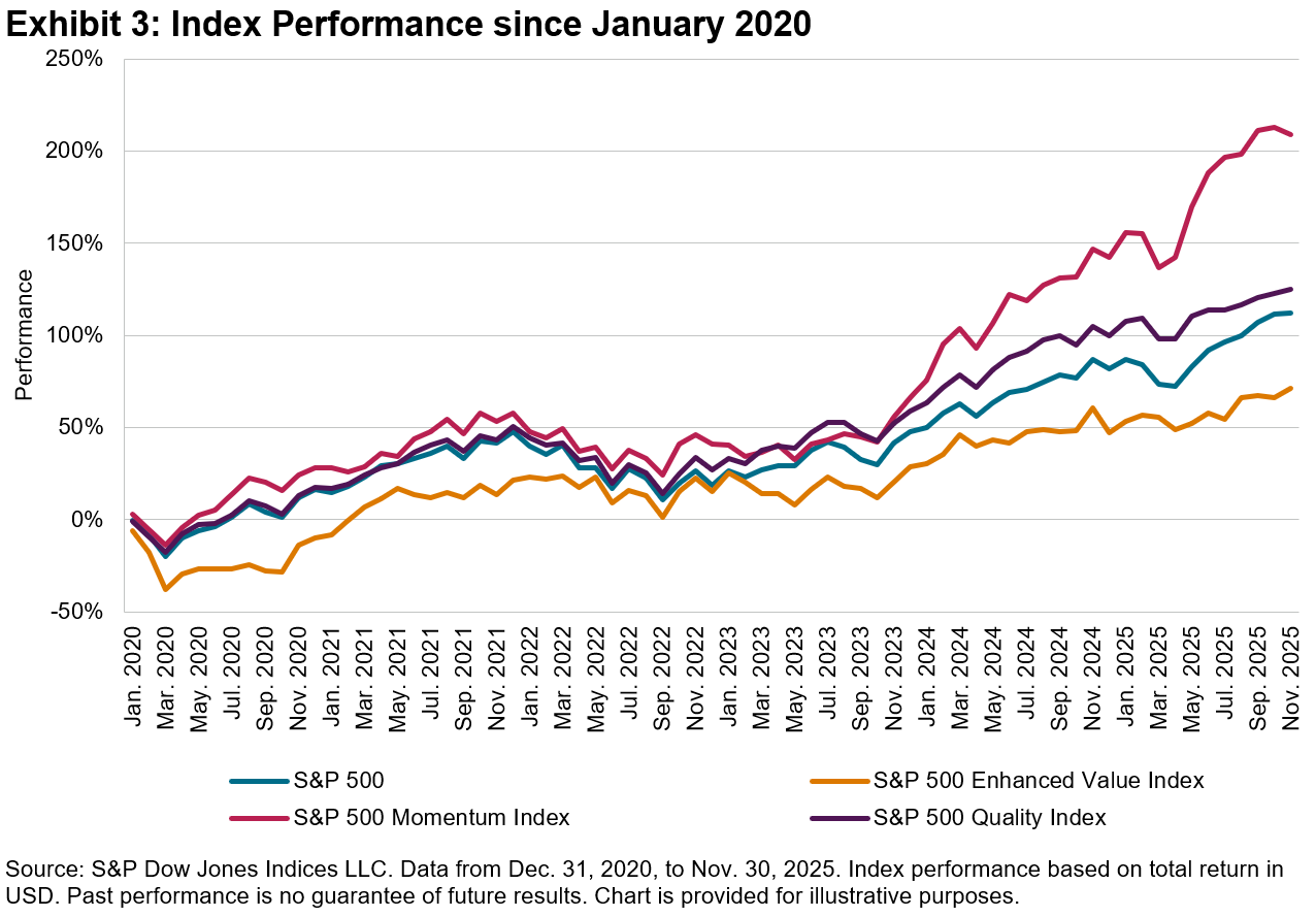 Finally, Exhibit 3 shows more recent performance, from January 2020 to November 2025. Compared with The 500, the S&P 500 Momentum Index has significantly outperformed, the S&P 500 Quality Index has also outperformed and the S&P 500 Enhanced Value Index has underperformed. This bares similarities to the late 1990s, though less extreme.